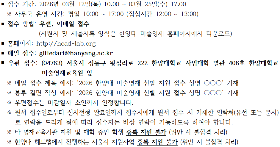 2026학년도 한양대 미술영재 선발 지원 접수 일정 및 방법을 안내합니다.