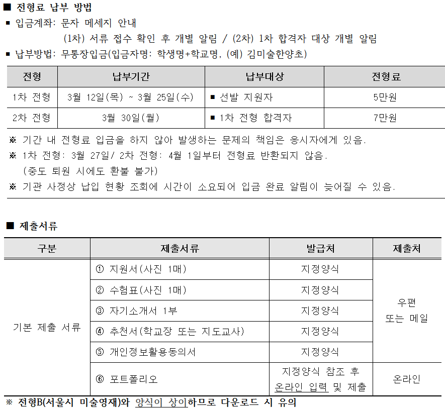 ■ 각 전형에 필요한 수험생 유의사항 및 해당 집합시간과 장소를 한양대 미술영재 홈페이지에서 반드시 확인해야 합니다.